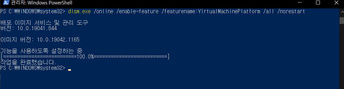 * dism.exe /online /enable-feature /featurename:VirtualMachinePlatform /all /norestart 실행