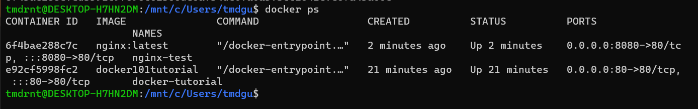 docker ps를통해 생성된 container목록 확인이 가능하다