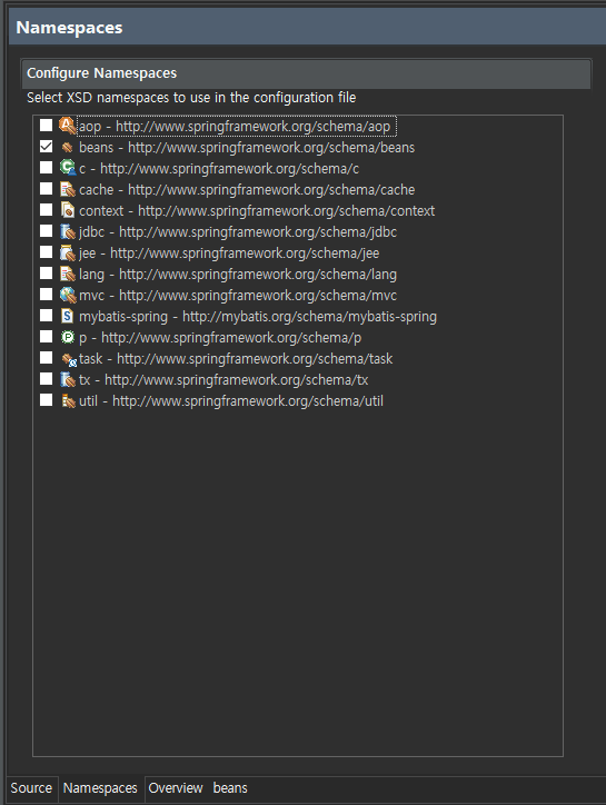 1-3) root.xml > namespace클릭 > jdbc,mybatic추가