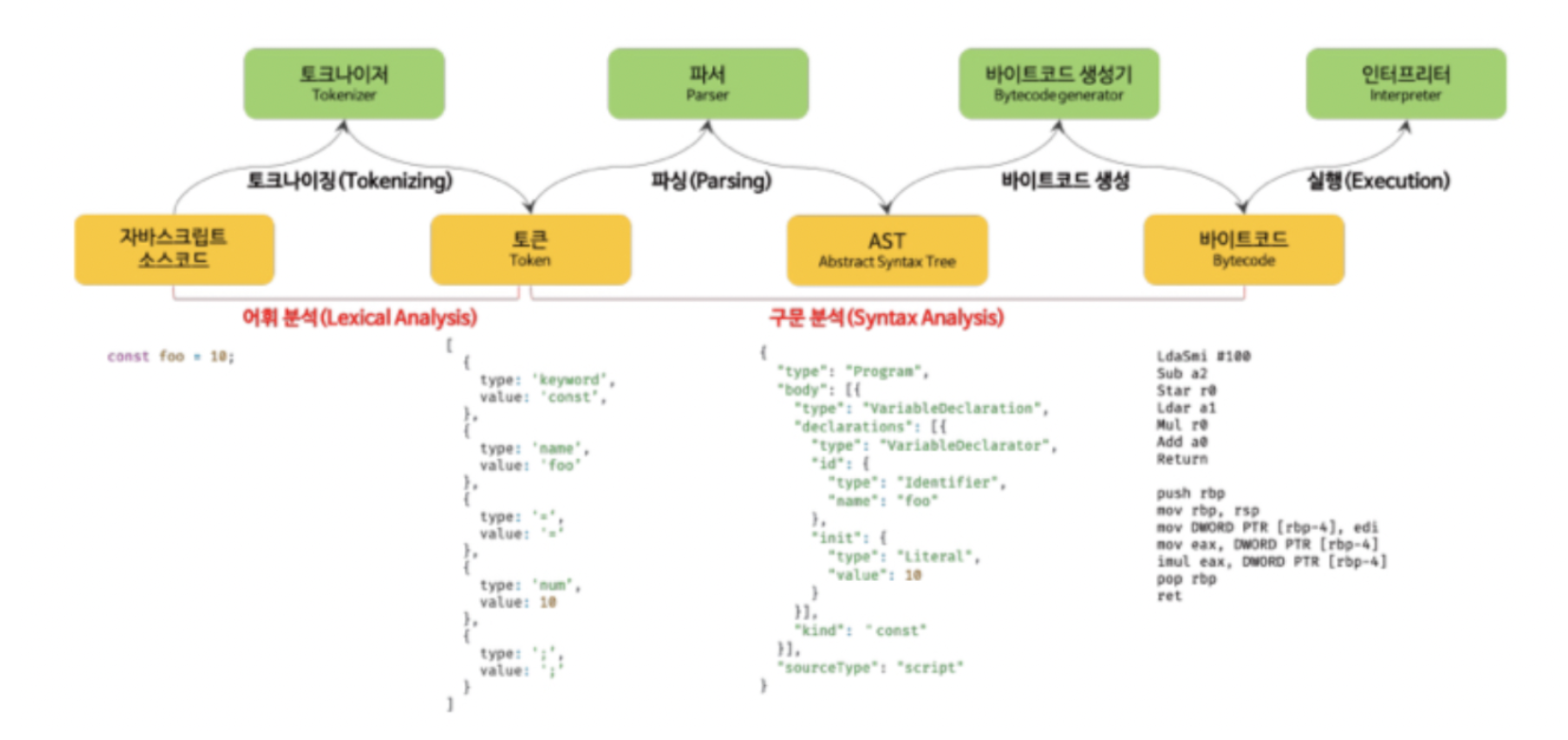 코드 (토크나이저)> 토큰 (파서)> Abstract Syntax Tree (바이트코드생성기)> 바이트코드 (실행) (인터프리터가 해석)